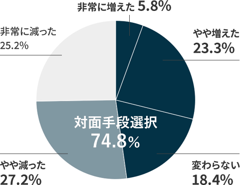 アンケートによれば、対面での商談や外部向けプレゼンテーションは、ほぼ半数の人が増えたあるいは変わらないと回答。やや減ったと答えた人を合わせると7割以上の人達が対面コミュニケーションを今でも選択していることが分かります。