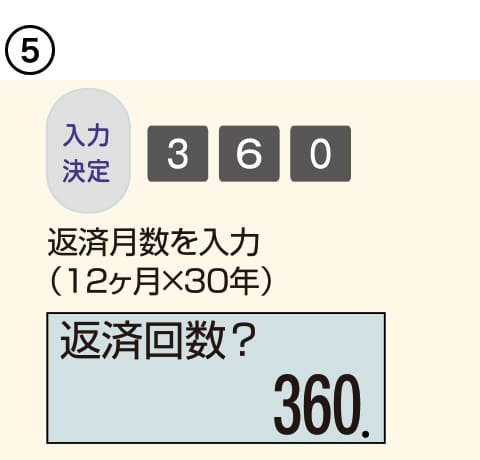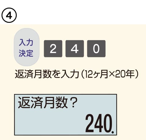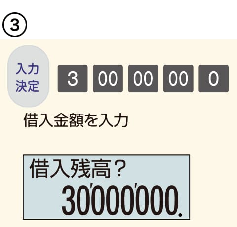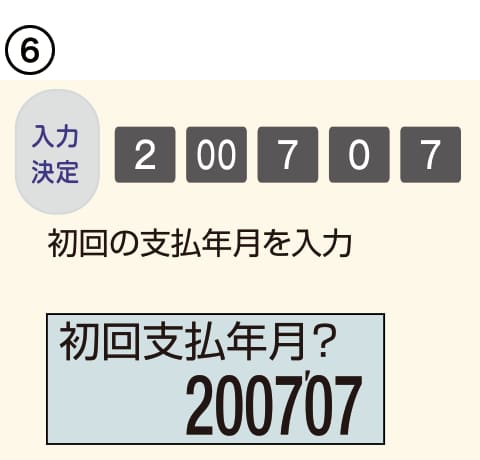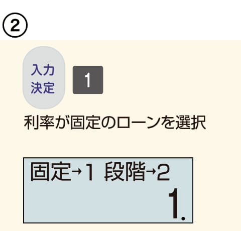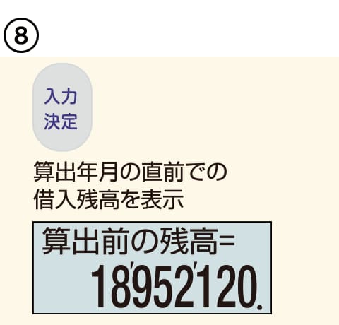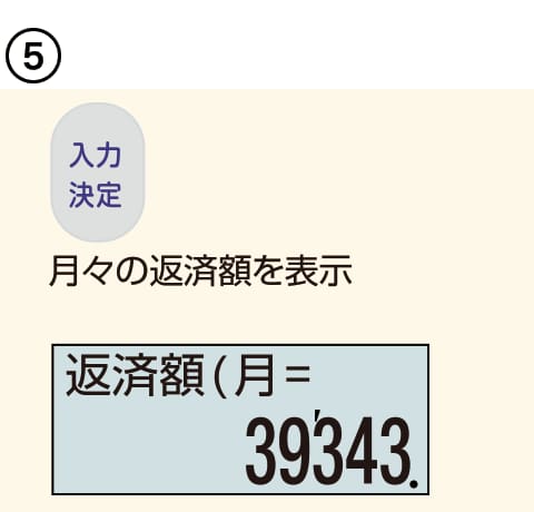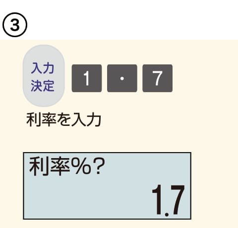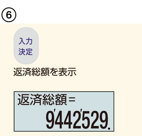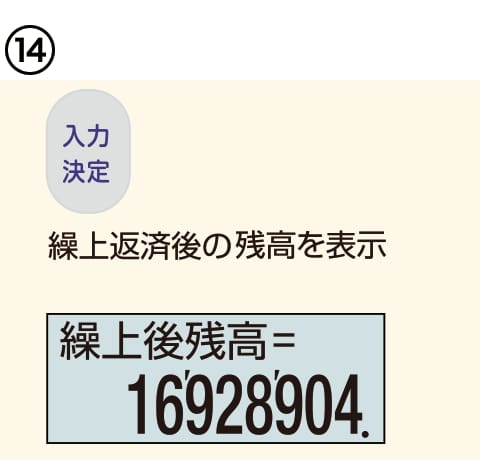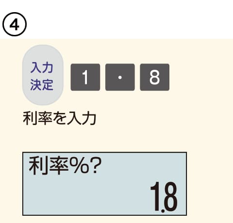 ※ 金融計算中は、前回入力した数値が表示されます。 数値をそのまま使うときは 入力/決定 ボタンを押すだけで次のステップに進めます。