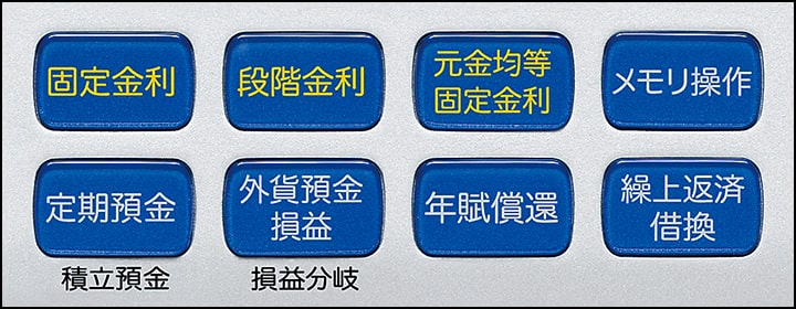 日本語表示の大画面液晶を搭載し複雑な計算が簡単にシミュレーションできる金融計算電卓。 繰上返済や借換計算にも対応しています。 実例付きの早わかりガイドを付属しています。