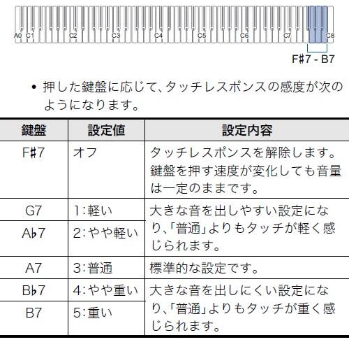 鍵盤の物理的な重さ自体を調整する機能はございませんが、タッチレスポンス感度の調整が可能です。