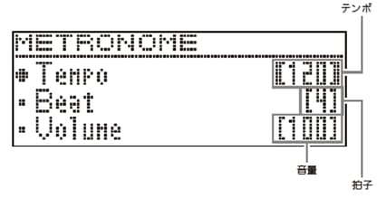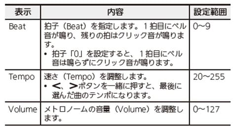 • メトロノームの速さ(テンポ)は、ミュージックライブラリー曲やMIDIレコーダー曲と共用です。