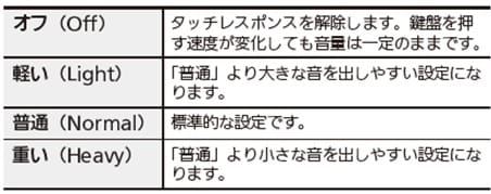 弾く強さによる音の出やすさを選択することができ、擬似的に鍵盤のタッチ感を変化させることができます。