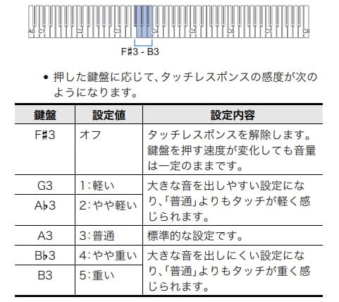 弾く強さによる音の出やすさ、鍵盤のタッチ感を変化させることが出来ます。