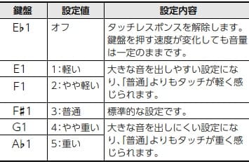 弾く強さによる音の出やすさ、鍵盤のタッチ感を変化させることが出来ます。
