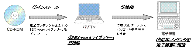 *CD-ROM内のソフト「EX-wordライブラリー」をパソコンにインストールし、「EX-wordライブラリー」を使用して、 追加コンテンツをパソコンから電子辞書に転送します。
