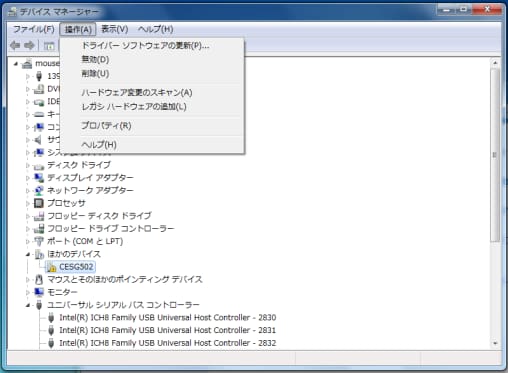 ほかのデバイスにある『CESG502』を選択し、メニューバー「操作(A)」をクリック、「ドライバーソフトウェアの更新(P)」を選択してください。
