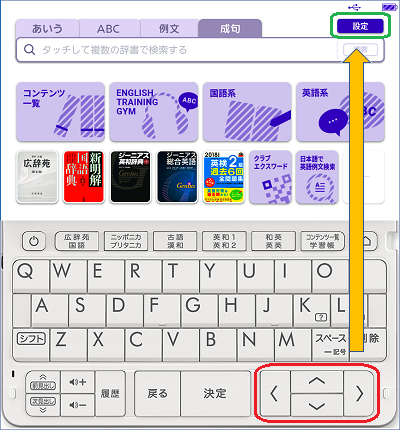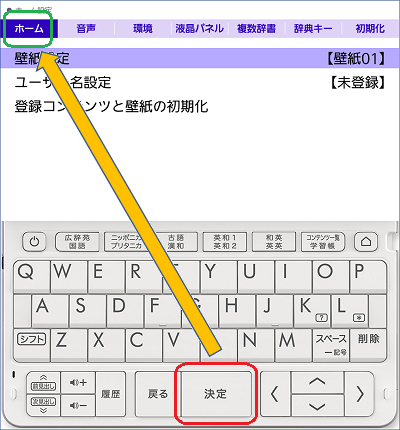 ③「ホーム画面」が表示されます。右キーを4回押し、「設定」にカーソルを移動します。