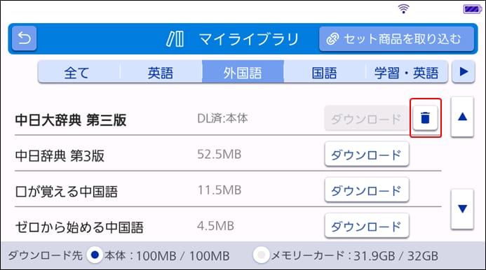 「中日辞典 第3版」のゴミ箱アイコンをタッチしてください。