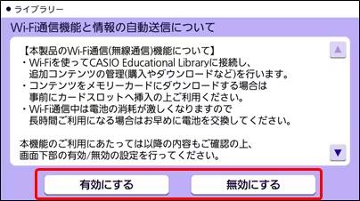 3.「Wi-Fi通信機能と情報の自動送信について」の説明が表示されます。「有効にする」「無効にする」のどちらかをタッチします。