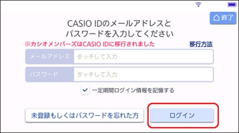 別売のXS-SH31DL / XS-SH24DLを購入し、中日辞典 第3版をダウンロード済みの方は、CASIO IDのメールアドレスとパスワードを入力して、ログインをタッチしてください。