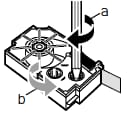 b の方向に左下の軸が回り始めるまで右上の軸を回してください。