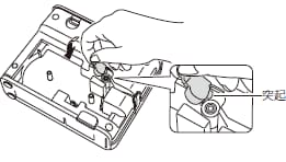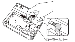 - プリンターを横置きにし、テープアダプター収納部オープンボタンを押して、カバーを取り外します。