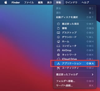 - 「Finder」>「移動」>「アプリケーション」をクリックします。