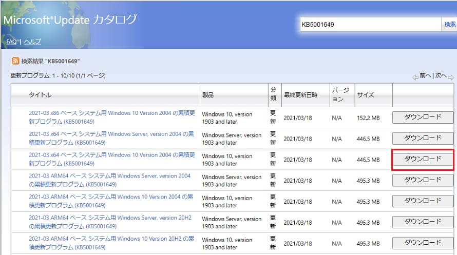 2. 下表より該当のOSのセキュリティ更新プログラム(KB5001649)「ダウンロード」をクリックします。