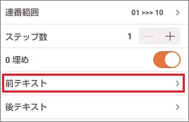 「前テキスト」:連番の前にテキストを挿入します。(最大30文字)