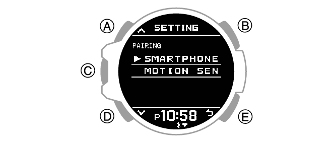 時刻モードの設定画面が開きます。 - (GSR-H1000) AまたはDボタンを押して、[PAIRING]にポインターを合わせます。