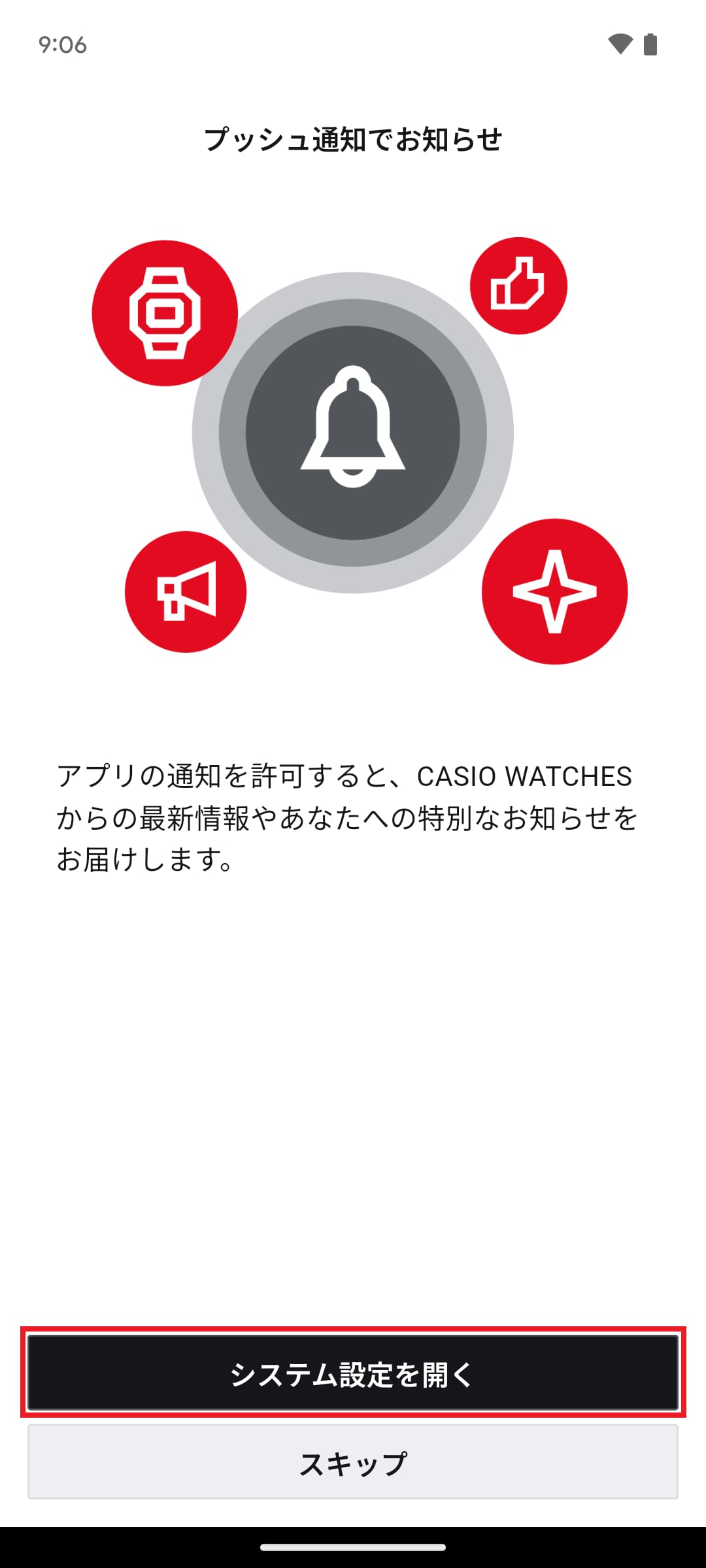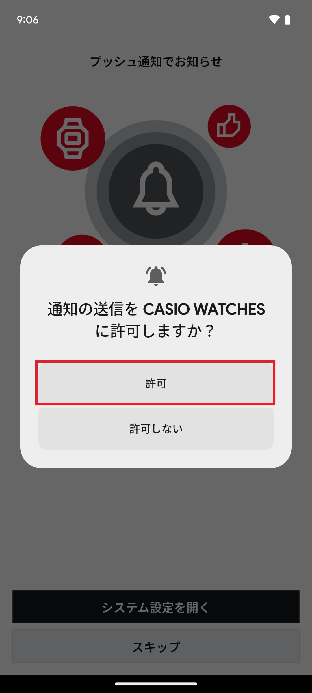 ※画像のように設定画面が表示されない場合は、実際に表示された内容を確認して設定してください。※時計によってはスマートフォンOSのペア設定リクエスト画面が表示されますので、許可してください。この表示は画面上部のステータスバーを上から下へスワイプすると表示されることがあります。