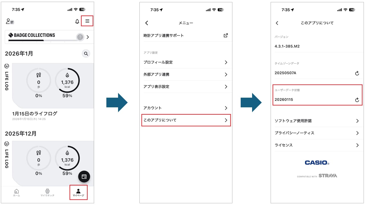 「マイページ」の画面右上 [≡]アイコンを選択 > [このアプリについて] > [ユーザーデータ状態]
