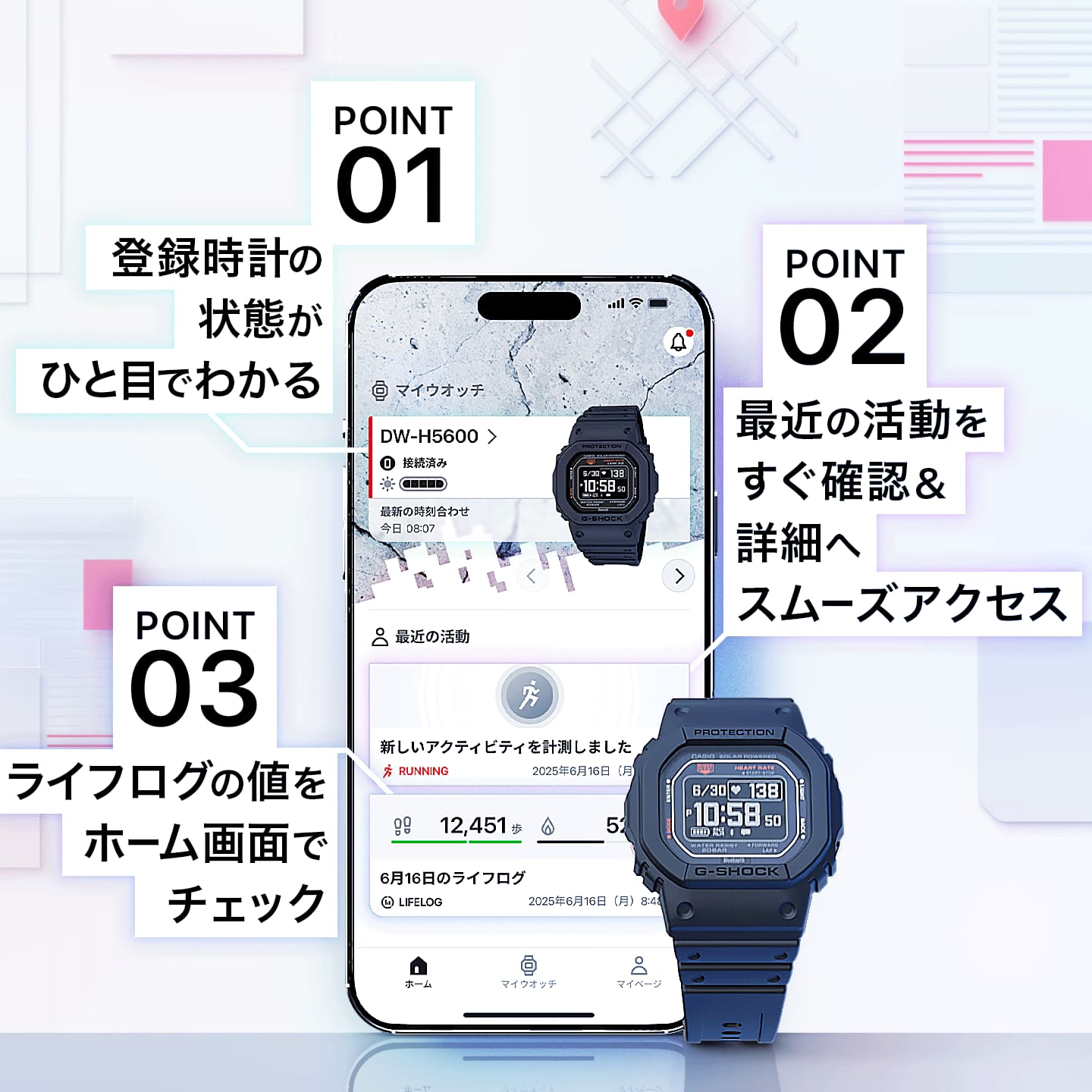 Bluetooth🄬対応モデルでは、行動ログを記録するタイム&プレイス機能があります。腕時計のボタン操作で、時刻と場所を地図上にスタンプすることでお気に入りスポットの記録や行動ログとして活用できます。さらに一部の機種ではライフログ機能が搭載されており、ご自身の活動量の確認ができます。また、プロフィールの設定も行えます。