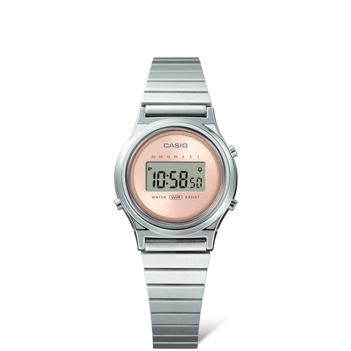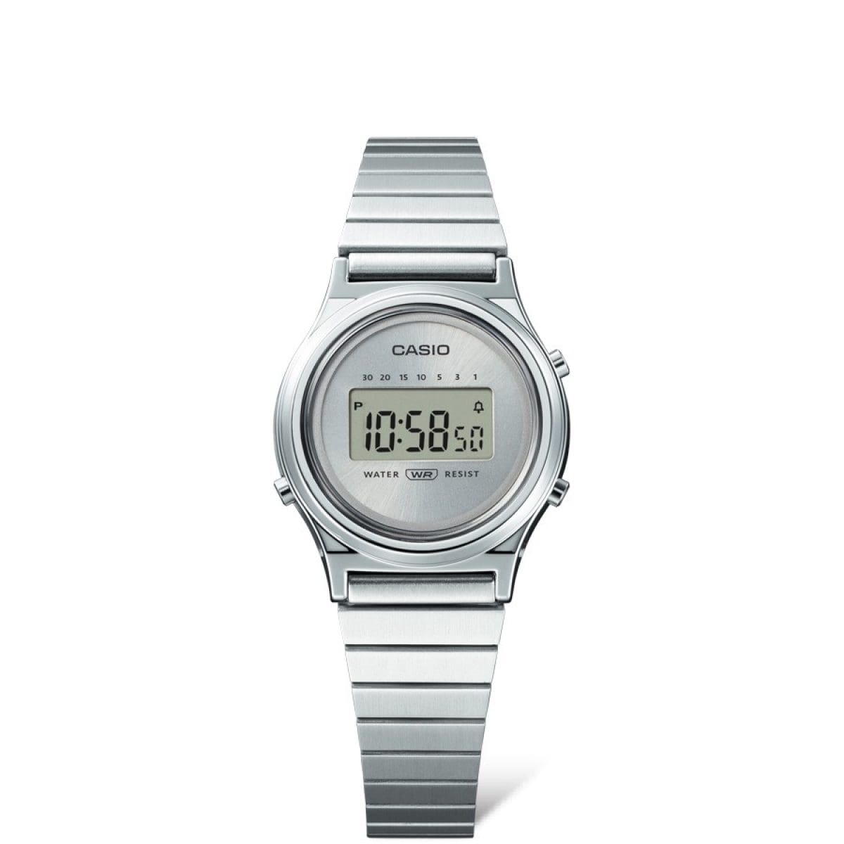 シンプルなラウンドフェイスにメタリックカラーをあしらい、メタルバンドを組み合わせました。アクセサリー感覚で着用できるコンパクトサイズのデジタルウオッチです。