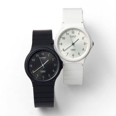 軽くて腕にフィットする3針タイプの薄型モデル、MQ-24をベースモデルに採用。シンプルなインデックスと色数を抑えた配色で、ミニマルなルックスに磨きをかけました。 バンドの樹脂素材にバイオマスプラスチックを使用し、環境にも配慮しています。