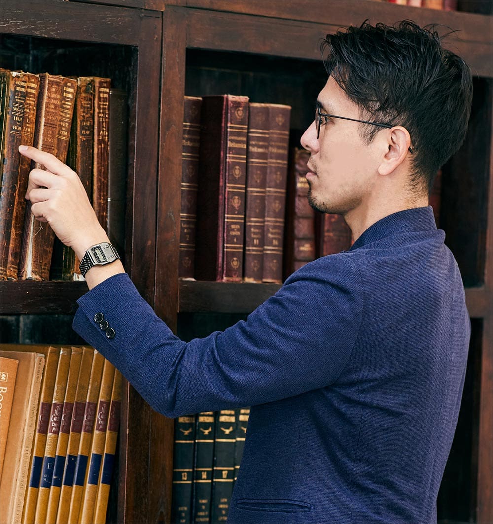 木の温もりを感じる閲覧デスクに向かって、選んだ一冊を広げてみる。 ページをめくる手元に、CASIO CLASSICの控えめな輝きが映えるんです。
