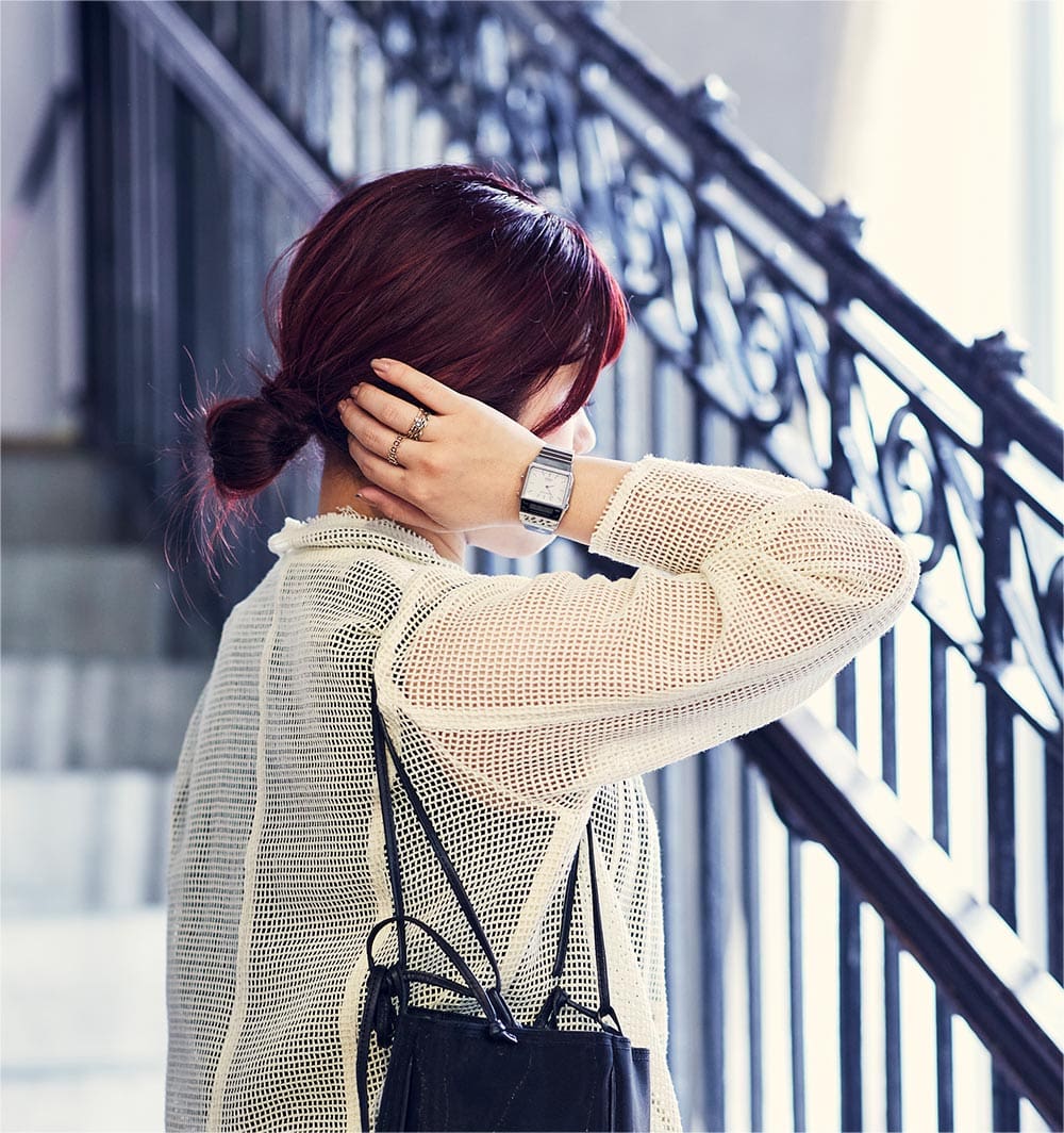 - 落ち着いた文字板のカラーがモノトーンの服装に温かみのあるアクセント