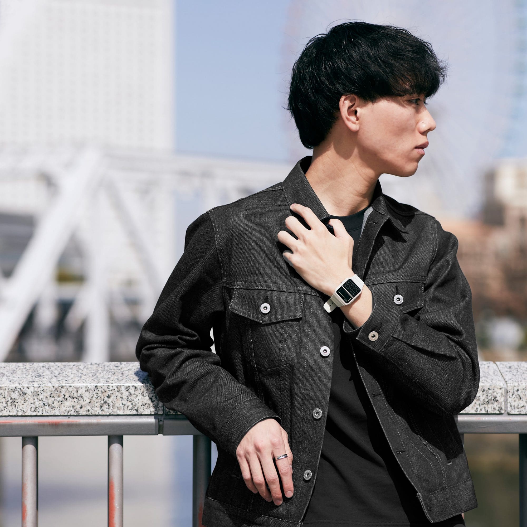 涼やかな空気がまだ残る昼景色。橋の欄干にもたれかかりながら、光を浴びる目の前の高層ビル群の壮大なスカイラインを見ます。黒いジャケットのスタイリッシュなコーディネートがそんな街並みにも調和。左腕のデジタルウオッチもモダンなファッションにマッチし、活気に満ちた街の鼓動と同じテンポで時を刻んでくれます。心地よい空気の中、行先も決めずに散策しながら自分らしく過ごす充実した時間です。