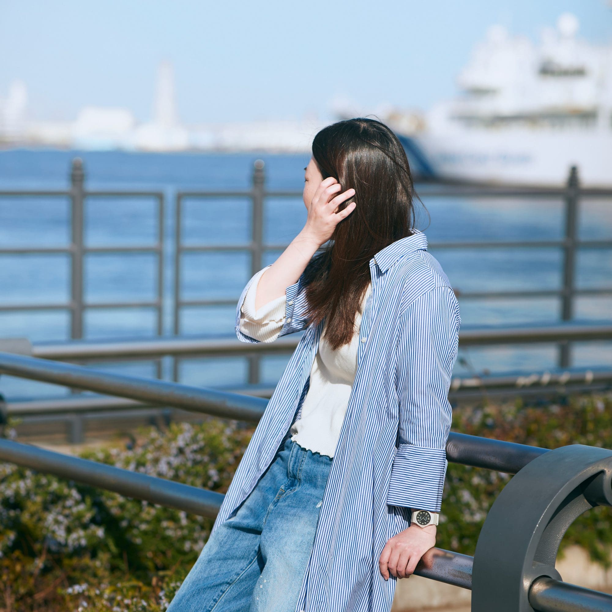 陽だまりに包まれる午後のひととき。視線の先の青い海面はまばゆく光り、遠くに行き交う船はそれぞれが静かに航路を辿っています。青と白のストライプシャツが軽やかに風に揺れ、白いアナログウオッチはフレッシュな清潔感をプラス。日常の中にある特別を告げる針の動きは、希望に満ちた記憶を刻みます。