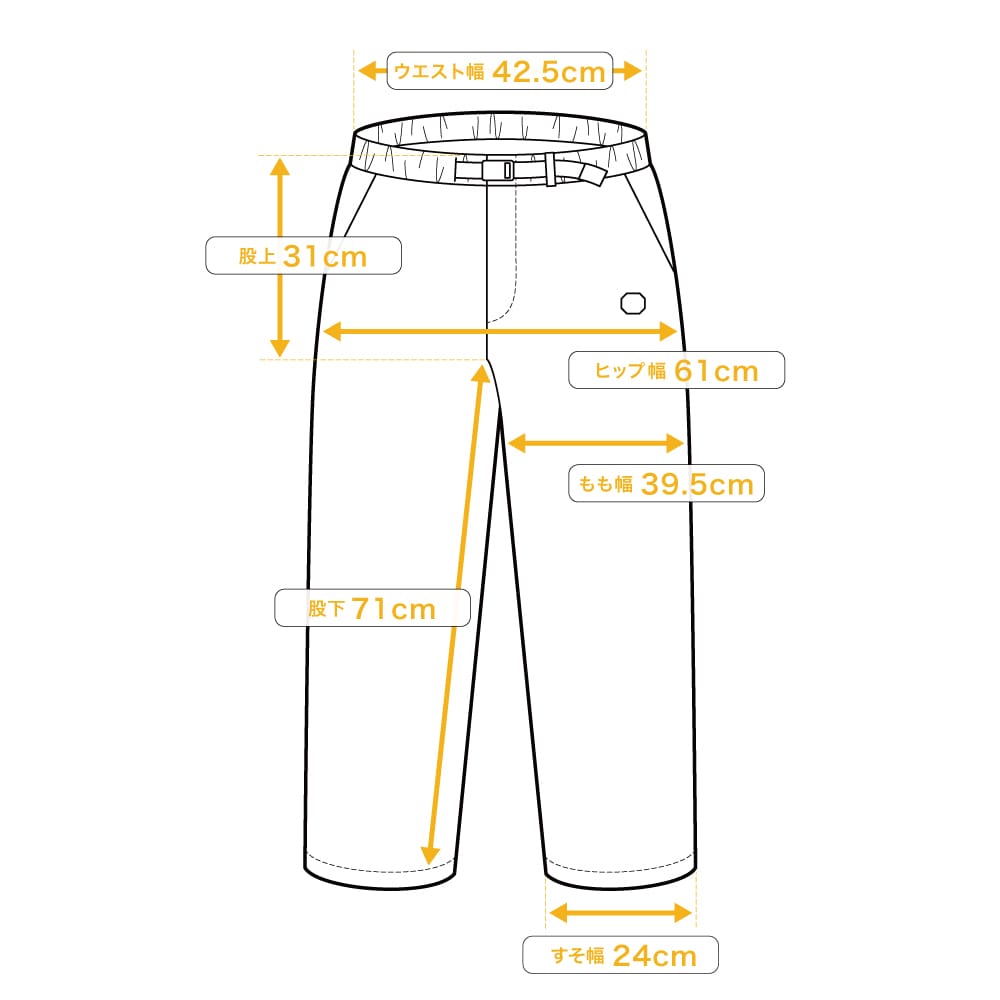 | ウエスト幅 | 股上 | 股下 | ヒップ幅 | もも幅 | すそ幅 | |