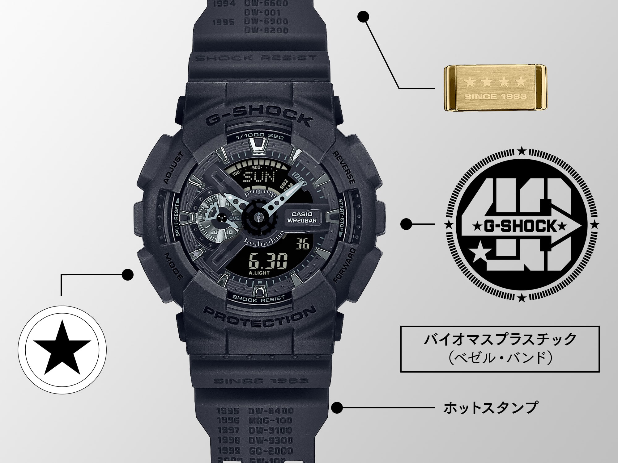 迫力のビッグケースに、複雑造形の文字板パーツ。2010年の登場以来、ロングセラーを続けるGA-110シリーズをスペシャライズド。G-SHOCKの歴史をホットスタンプ印刷で刻んだバンドに加え、遊環、裏蓋に★マークや記念ロゴを刻印、40分位置に★マークをあしらうなど、随所にアニバーサリーにふさわしいこだわりをちりばめました。
