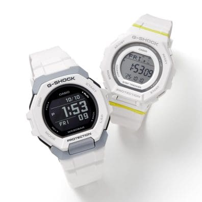 G-SHOCKのスポーツラインG-SQUAD。 加速度計、距離測定機能、スマートフォン連携や高精細ディスプレイなど、ランニングをはじめとしたトレーニングに役立つ機能を備えています。スマートフォンのGPS機能と連携することで、より正確な走行距離や走行ペースの計測ができ、自動でタイムを計測するオートラップ機能も搭載しています。 また、専用アプリ「CASIO WATCHES」でライフログやアクティビティ履歴など自身の運動記録を直感的に確認することができます。 バイブレーションアラームにより、トレーニング中の経過時間や消費カロリーのアラート取得、スマートフォンからの電話、メール、SNSの通知も受信可能です。 ディスプレイには高精細MIP液晶やスーパーイルミネーターを採用。 バンドにはソフトウレタン素材を使用しフィット感を高めるとともに、5mmピッチのバンド⽳により細やかな⻑さ調整が可能です。 ケース、バンドなどの主な樹脂パーツにバイオマスプラスチックを使用し、環境にも配慮しました。 日常の健康管理からランニングの持久力強化まで、幅広く役立つG-SQUADです。