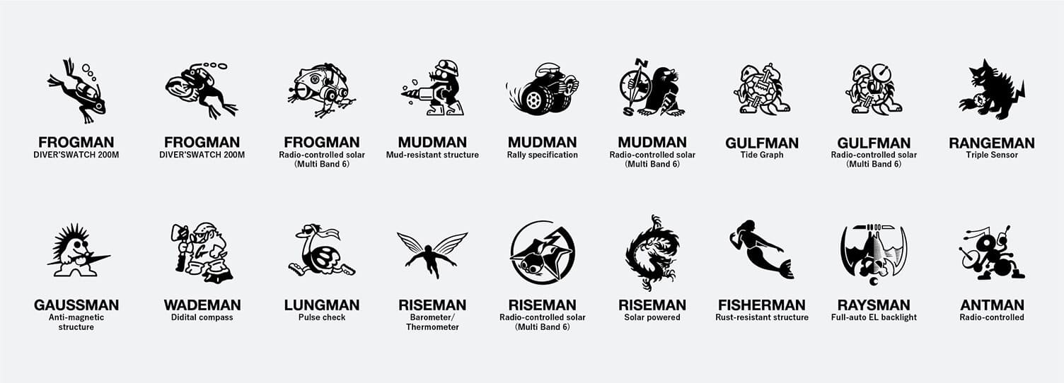歴代のG-SHOCKの裏蓋刻印に使用されてきたキャラクターを時計全体にあしらったシリーズです。