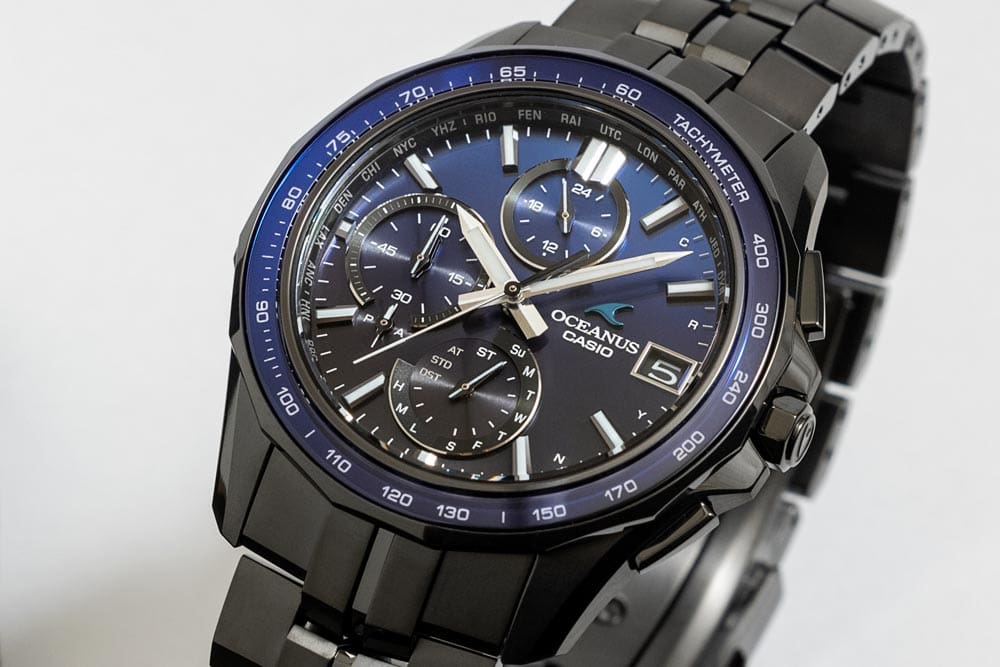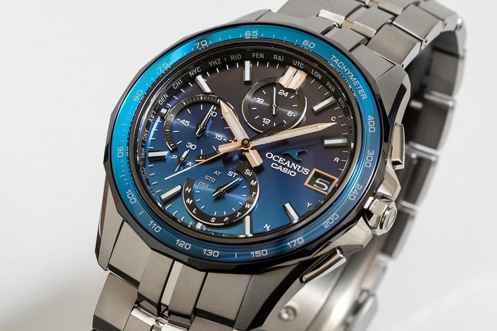 まず初めに紹介するのは、世界限定1,500本の限定モデル『OCW-S7000A-2AJF』。シリーズの最大の特徴であるタキメーターを刻んだサファイアガラスベゼルには、リング状に加工したサファイアガラスの裏面にライトブルー蒸着を施して着色。さらにMantaならではの多角形ベゼルのベース部分をブラックにすることで、ライトブルーを際立たせている。そして黒文字板の『OCW-S7000-1AJF』に対し、文字板にもライトブルーを基調とするグラデーションIPを採用。OCEANUSブルーで表現されたその美しい階調は、まるで光の反射や吸収により幾重にも異なった青が生まれる海の色を彷彿させるようである。また“計測器の美しさ”をデザインテーマとした「OCW-S7000」シリーズらしく、ストップウオッチ計測のスタートの象徴である12時のインデックスや時分針、秒針などにアクセントとしてピンクゴールドを配色している。個性的なフェイスは好みが分かれそうであるが、信頼性や安心感を連想させるライトブルーでまとめられたことにより、洗練された優しい印象を与え、ネイビーやグレーなどのスーツスタイルにも馴染み、ビジネスシーンでも合わせやすいのではないだろうか。