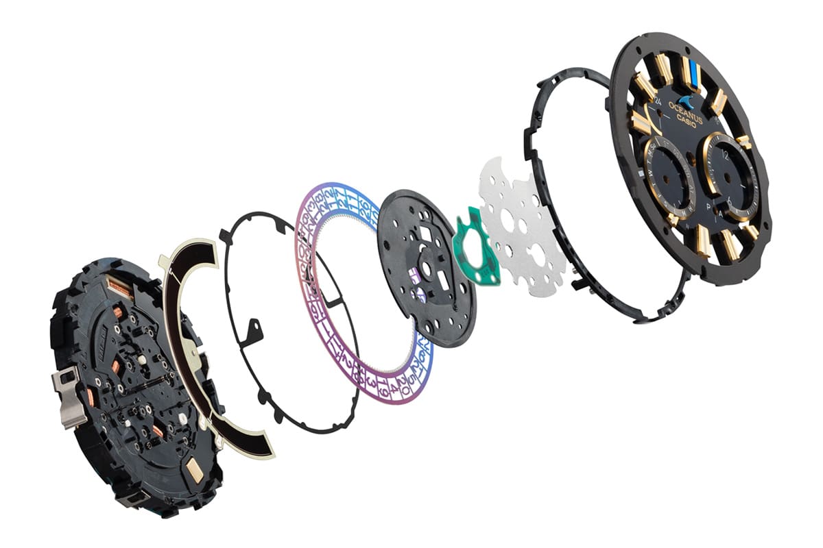 その核心にあるのが、カシオ独自のソーラー充電システムのタフソーラーをさらに進化させた新たなソーラーモジュール“ガリウムタフソーラー”の搭載と言っても過言でないだろう。近年先端半導体素材として注目されているガリウム化合物を基盤材料とし、JAXAの小型月着陸実証機「SLIM」にも採用された太陽電池技術を応用することで、腕時計という限られたスペースに見事に実装することに成功。これにより宇宙環境に適した信頼性に加え、従来のソーラーと比べて発電効率が約2〜5倍と飛躍的に向上。日付表示のわずかな隙間に差し込む光のみで発電し、電波受信などの各種機能を安定駆動させることが可能となった。さらにソーラーセルのサイズも大幅に小型化でき、OCEANUSの次なる舞台へと向けた進化の道標となっている。