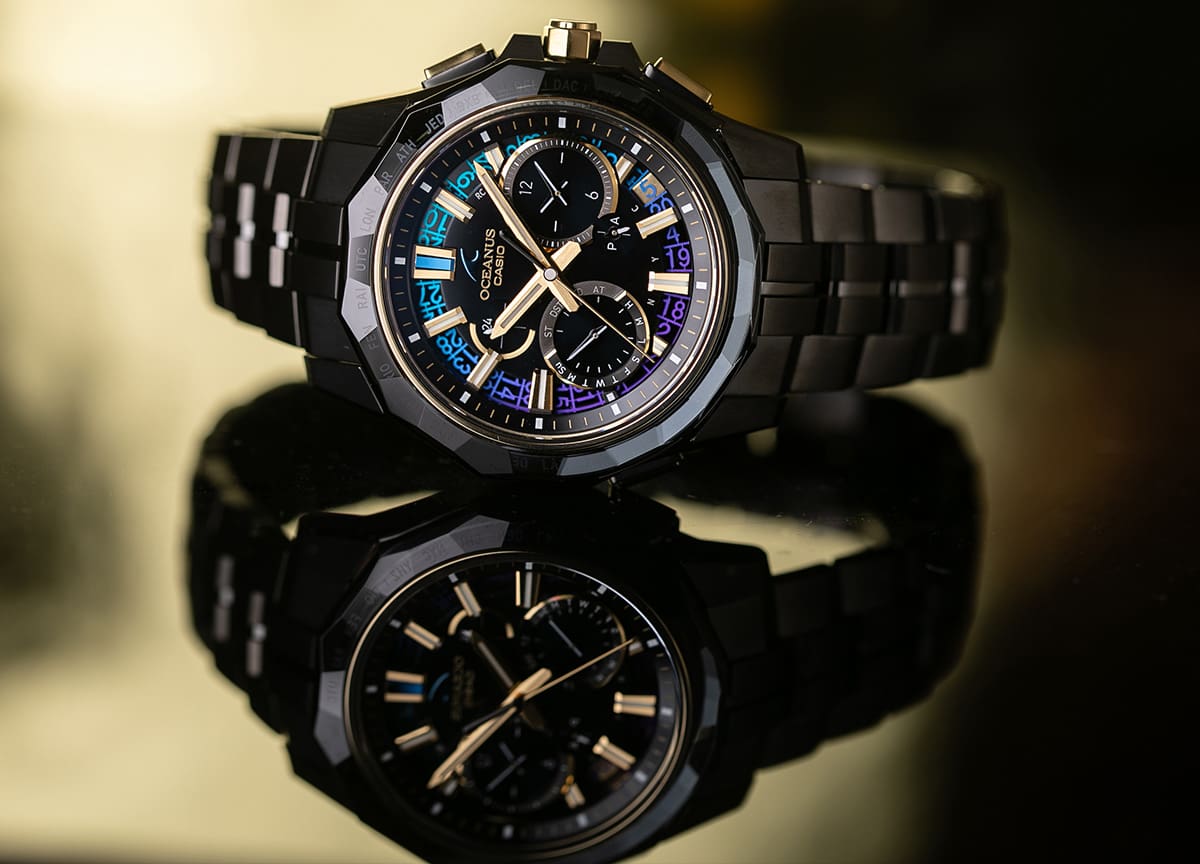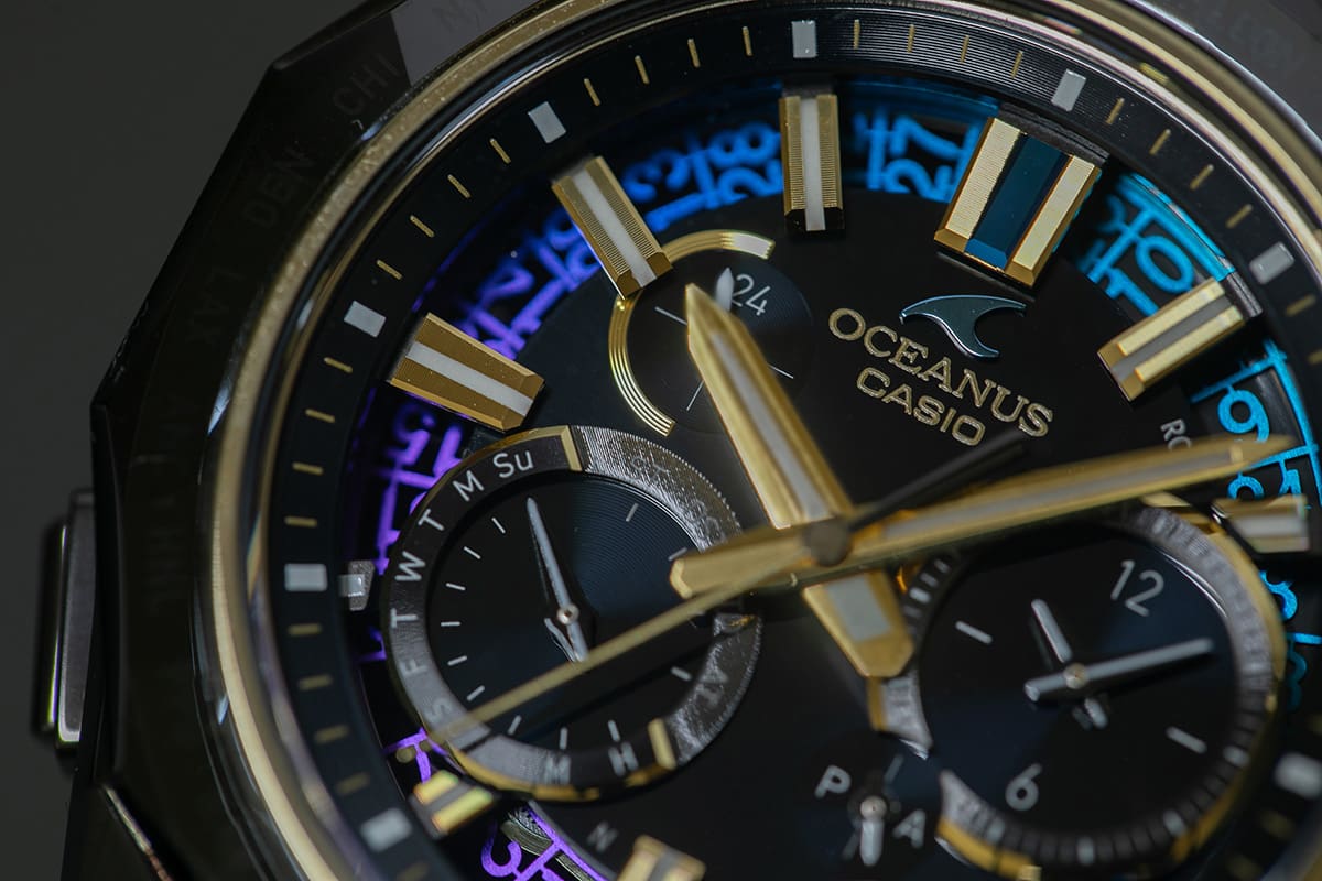 そしてカラーリングも特筆すべき要素である。限りなく黒に近いミッドナイトブルーとゴールドの組み合わせは、カシオが追求する「はじまりの灯火」を象徴し、OCEANUSの探求してきた青の深遠さとも絶妙に絡み合うことで、その存在感を際立たせている。この巧みな色彩設計に加え、日車に施されたブルーパープルのグラデーション蒸着や4時位置下のカレンダー窓など随所にあしらわれたゴールドが、時計全体に独特の華やかさと奥行きをもたらしている。