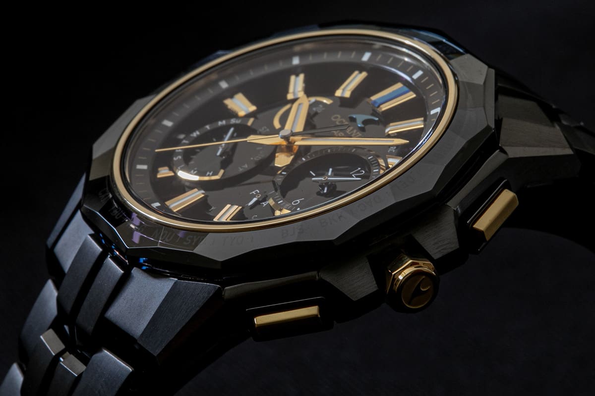 美しさはフェイスデザインだけにとどまらない。チタン素材にDLCコーティングを施し、素材表面の耐摩耗性を向上。美しいブラックの発色も際立つその技術が、このモデルにも惜しみなく使われている。さらに鏡面部分にはザラツ研磨が施され、平滑度の高い仕上げを実現するなど、耐久性と美しさを両立。これらのディテールこそ、OCEANUSが追求する革新と美が融合した一つの完成形なのである。