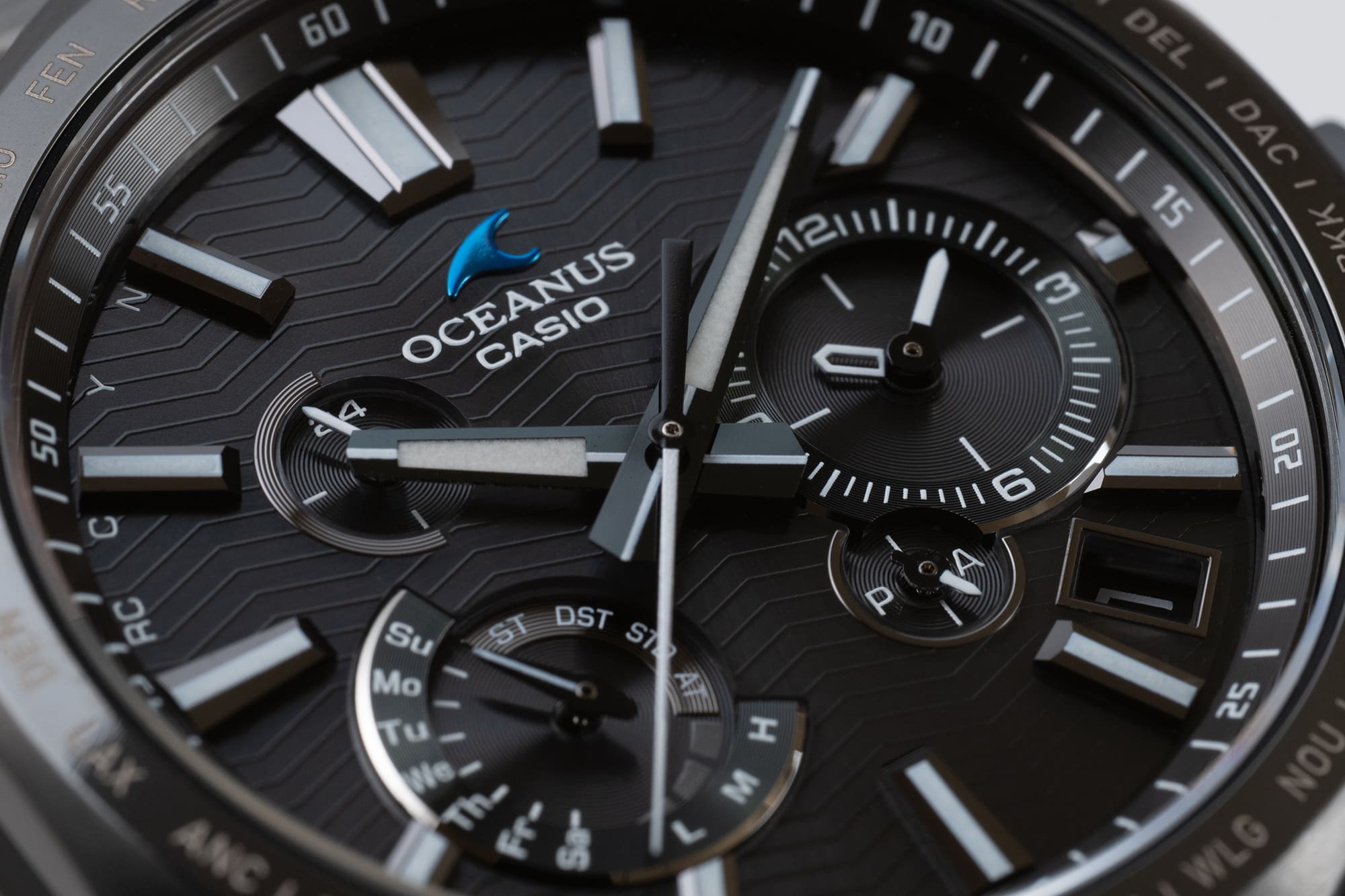 全面透過の黒印刷による文字板には、OCEANUSの着想源である“海の波”からインスパイアされたテスクチャーが施され、その力強くモダンなパターンで表現された奥行きのある意匠が、シンプルなオールブラックに深みをプラスし、腕元に唯一無二の存在感を生み出している。