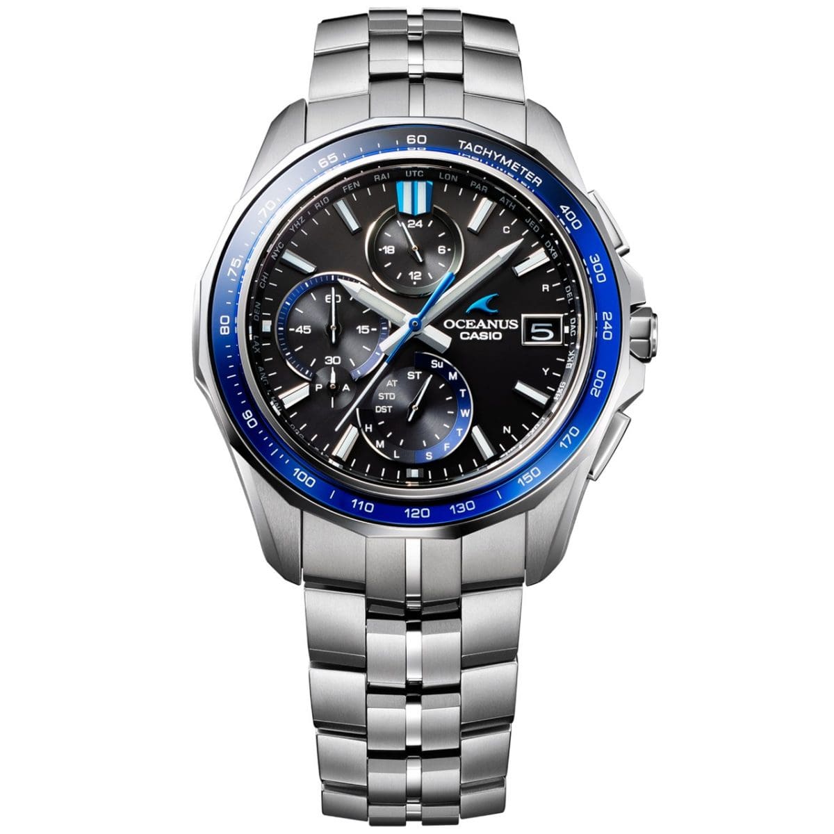 『OCW-S7000F』のブルーがこれほどまでに雄弁なのは、単に色が美しいからではない。その背景には、Mantaシリーズならではの造形思想がある。フラットで薄く、無駄を削ぎ落としたケースライン。エッジは鋭く、面は広く、光を受け止めるための“余白”が計算されている。そして、その造形美を最前線で受け止めているのが、サファイアガラスベゼルだ。透明感を持つサファイアは、色と光をそのまま受け入れ、反射と透過を同時に生み出す存在。『OCW-S7000F』では、ダイアルのブルーと呼応するサファイアガラスベゼルが、光の角度によって青の濃淡を変えながら、Mantaのシャープなフォルムを際立たせている。チタン外装との相性も見逃せない。軽量でありながら高い耐摩耗性を備えたチタンは、OCEANUSの掲げる“軽やかな強さ”を体現する素材。そのクールな質感に、ガラス特有の艶と深みのあるブルーが重なることで、時計全体に張り詰めた緊張感と、どこか静かな余裕が同時に宿る。金属、ガラス、そして色。それぞれ異なる素材が交差することで、『OCW-S7000F』のMantaフォルムは、より立体的に、より鮮明に浮かび上がる。