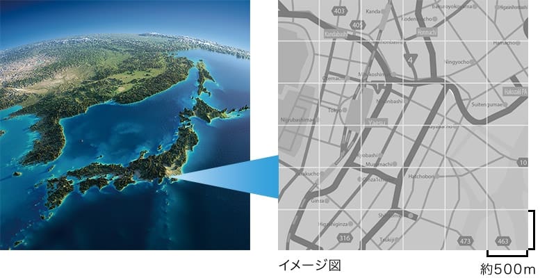 GPS衛星から受信した位置情報と地球全域を約500m単位でグリッド化した高分解能の地図データを用いることで、より正確な現在地の特定を実現。