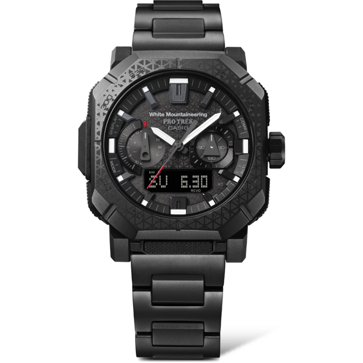 「服を着るフィールドはすべてアウトドア」をコンセプトに掲げるWhite Mountaineering®(ホワイトマウンテニアリング)とのコラボレーションモデル第2弾。ベースモデルにトリプルセンサーとBluetooth®搭載電波ソーラーを備えたハイエンドラインPRW-B1000を採用。ソリッドな造形にマットブラックやトライアングルパターンなどのアイコニックなエレメントをあしらい、ミニマルでスタイリッシュな装いに仕上げました。ブランド哲学であるデザイン・実用性・技術の融合を、研ぎ澄まされた機能美で体現したスペシャルモデルです。