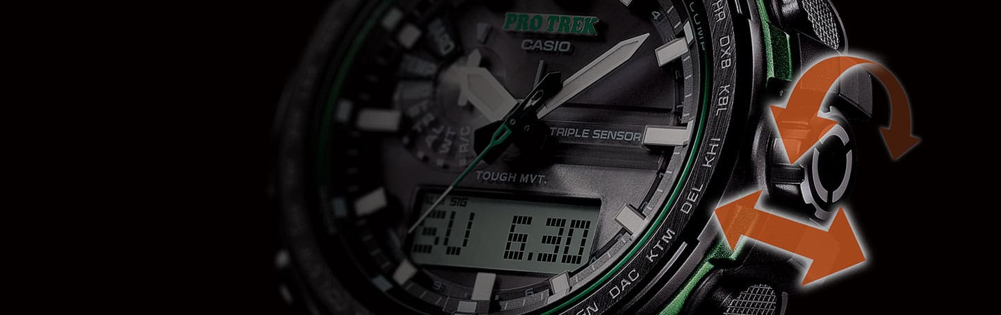 ひとつの針に複数の役割を与えるマルチミッションドライブに、電子式リューズスイッチを搭載。多彩な針の動きによる計測値の表示、素早いモード切り替えなどを可能にするとともに、ワールドタイム都市設定や計測値補正など、各種機能の感覚的な操作も実現する。