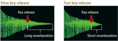 រយៈពេលនៃការបញ្ចេញសូរខ្ទរ និងការបញ្ចេញសំឡេងដែលព្យាណូបង្កើតឡើងអាចប្រែប្រួលអាស្រ័យលើល្បឿនដែលអ្នកលេងព្រលែងម្រាមដៃ បន្ទាប់ពីប៉ះឃី។ ប្រព័ន្ធឃីបតថ្មីរួមបញ្ចូលនូវឧបករណ៍បញ្ជាបិទឃីដែលបង្កើតឡើងវិញនូវភាពបម្រែបម្រួលសំឡេងទាំងនេះដែលកើតពីការព្រលែងឃីតាមធម្មជាតិ។ ការបញ្ចេញសំឡេងសូរខ្ទរពិតប្រាកដដែលមានអារម្មណ៍ដូចព្យាណូធំត្រូវបានបង្ហាញជាលទ្ធផល។