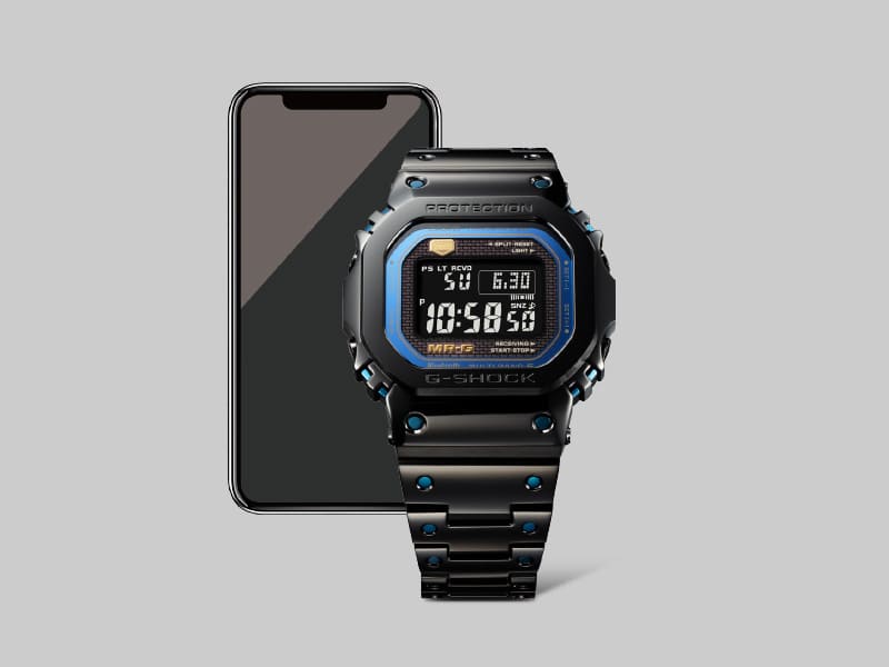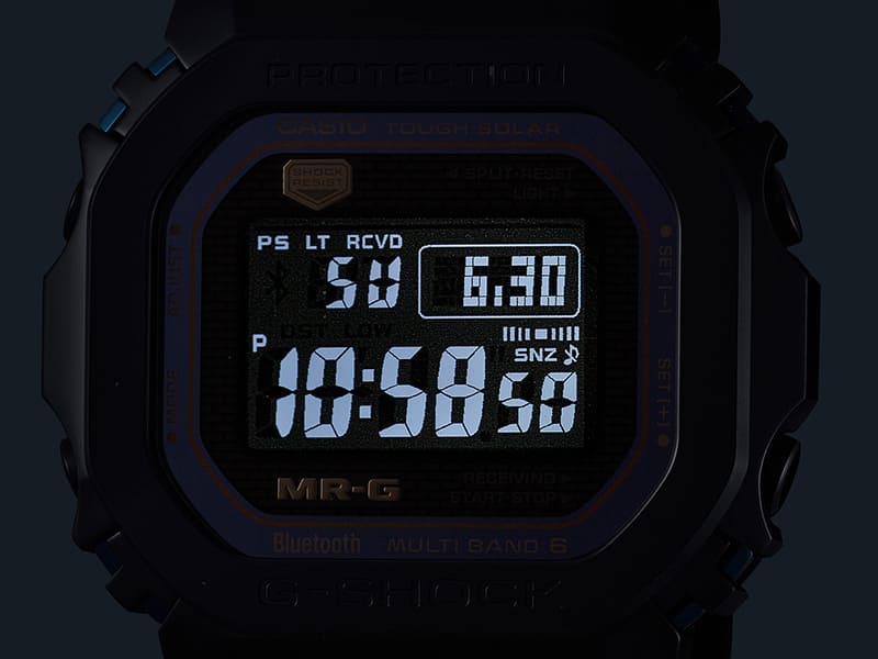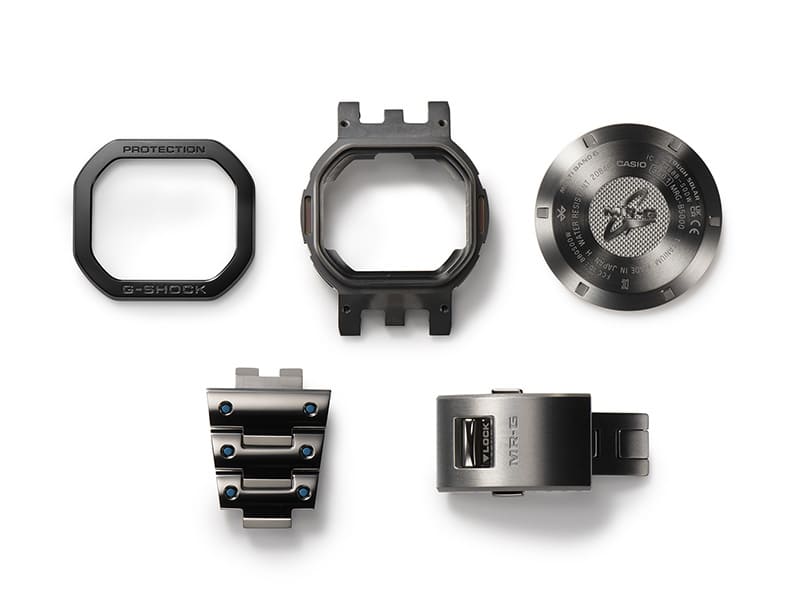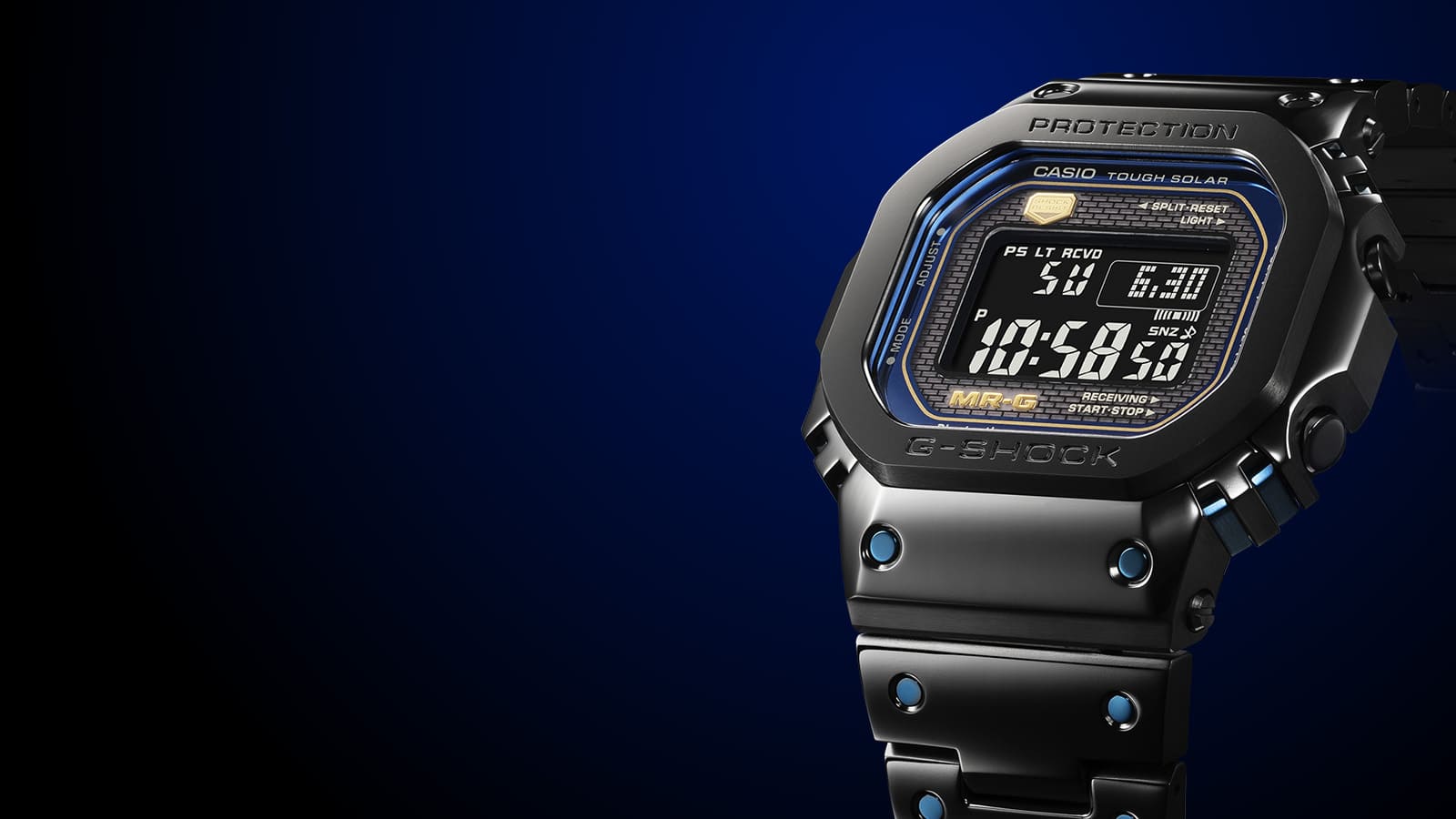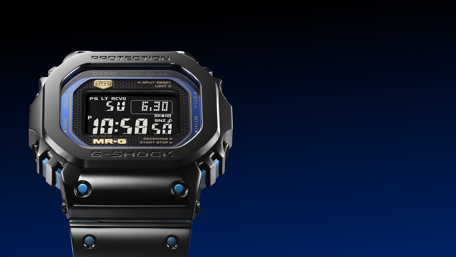 សូមស្វាគមន៍ស៊េរី MRG-B5000 ដែលផ្អែកលើម៉ូដែល G-SHOCK ដំបូងគេបង្អស់ និងច្នៃឡើងជាមួយនឹងលោហធាតុទំនើបបំផុត និងការចាក់ពុម្ពយ៉ាងល្អិតល្អន់ ដែលជាសញ្ញាសម្គាល់នៃត្រកូលនាឡិកាដ៏ទំនើបនៃម៉ូដែល MR-G ។ នាឡិកាដៃដែលឈានមុខគេទាំងនេះគឺជាការសិក្សាលើជំនាញសិប្បកម្មលោហៈ។ ប្រអប់ និងកងមុខនាឡិកាផលិតឡើងពីសំលោហៈទីតានីញ៉ូមមហារឹងផ្អែកលើ Ti64 ខណៈដែលខ្សែនាឡិកាផលិតពីសំលោហៈទីតានីញ៉ូមពិសេសមួយទៀត DAT55G ដែលលោហៈទាំងពីរនេះរឹងជាងទីតានីញ៉ូមសុទ្ធបីដង ហើយអាចធ្វើការបានយ៉ាងមានប្រសិទ្ធភាពខ្ពស់។ ខាងលើកងមុខនាឡិកាផលិតឡើងដោយ COBARION ដែលជាសំលោហៈក្រូមកូបាល់ដែលរឹងជាងទីតានីញ៉ូមសុទ្ធបួនដង។ កងមុខនាឡិកាតែមួយមុខមានសមាសធាតុ 25 ផ្សេងៗគ្នា ដែលផ្នែកនីមួយៗត្រូវបានប៉ូលាសម្រាប់វាយនភាពលម្អិតគួរឱ្យភ្ញាក់ផ្អើល។ រចនាសម្ព័ន្ធការពារច្រើនជាន់ដ៏ទំនើបបំផុត រួមបញ្ចូលនូវរ៉េស្ស័ររាបស្មើ និងទ្រនាប់ស៊ីលីកូនទៅដល់កងមុខនាឡិកាពហុសមាសធាតុ ដែលធានាបាននូវការស្រូបយកការប៉ះទង្គិចយ៉ាងល្អឥតខ្ចោះ ដើម្បីការពារម៉ូឌុល MR-G ដែលមានបន្ទះការពារពណ៌មាសពិសេសនេះ។ មានការបំផុសគំនិតដោយការគូសវាសដោយទឹកថ្នាំ និងការសរសេរអក្សរផ្ចង់ដែលធ្វើឡើងដោយទឹកថ្នាំពណ៌ខៀវ MRG-5000BA មានបំពាក់នូវវីសលើខ្សែនាឡីកា និងសមាសធាតុកងមុខ ដែលស្រោបដោយបន្ទះអ៊ីយ៉ុងពណ៌ខៀវទៅលើបាតនៃស្រទាប់កាបូនដូចពេជ្រខ្មៅ។ អារម្មណ៍លើដំណើរការបញ្ចេញចំហាយពណ៌ខៀវ បន្ថែមនូវភាពទាក់ទាញយ៉ាងខ្លាំងចំពោះមុខនាឡិកា ហើយលំនាំឥដ្ឋដែលអណ្តែតឡើងគឺជាសញ្ញាបង្ហាញពីការរចនា DW-5000 G-SHOCK ដើម។ ភាពស្រស់ស្អាតនៃលោហៈធាតុទាំងនេះផ្តល់នូវភាពស្រស់ស្អាតនៅពេលដំណើរការផងដែរ ជាមួយនឹងការក្រិតខ្នាតដែលគ្រប់គ្រងដោយវិទ្យុ និងការផ្គូផ្គងទូរសព្ទឆ្លាតវៃតាមរយៈ Bluetooth®។