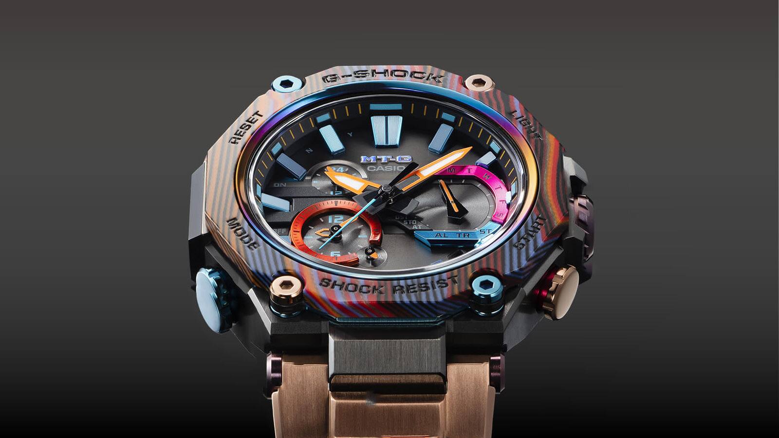 សូមណែនាំអំពីរចនាប័ទ្មភ្នំអាថ៌កំបាំងចម្រុះពណ៌ — ភាពធន់រឹងមាំដែលផលិតឡើងពីការរួមបញ្ចូលគ្នារវាងលោហៈ កាបូន និងជ័រ។ បំផុសគំនិតដោយលំនាំពហុស្រទាប់ដ៏អស្ចារ្យនៃភ្នំឥន្ទធនូ ម៉ូដែល MTG-B2000 ពិសេសនេះត្រូវបានរចនាឡើង ដើម្បីការពារការប៉ះទង្គិចក្នុងកម្រិតអតិបរមា។ កងមុខនាឡិកាពហុពណ៌ត្រូវបានផលិតចេញពីជ័រដែលស្រោបដោយកាបូន ដែលត្រូវបានបង្កើតឡើងពីសន្លឹកកាបូន និងសរសៃកញ្ចក់។ ភាពធន់រឹងមាំនៃកាបូន និងសរសៃកញ្ចក់ និងលំនាំមិនច្បាស់លាស់ដែលបានបង្កើតឡើង នៅពេលគេកាត់បន្ថយទំហំកងមុខនាឡិកា ប៉ុន្តែផ្ដល់ភាពរឹងមាំ និងមានទម្ងន់ស្រាលលើនាឡិកាដ៏ស្រស់ស្អាត ដែលមានលំនាំពណ៌ប្លែកពីគេ។ កងមុខនាឡិកាធ្វើពីកាបូនចម្រុះពណ៌ កងដែលស្រោបដោយអ៊ីយ៉ុងឥន្ទធនូ បន្ទះអ៊ីយ៉ុងពណ៌មាសផ្កាឈូក និងប្រអប់នាឡិកាពណ៌ខៀវព្រាលមកជាមួយគ្នា ដើម្បីបង្កើតអុកស៊ីតកម្មនៃសារធាតុរ៉ែដែលបន្សល់ទុកដោយសកម្មភាពភ្នំភ្លើង និងការផ្លាស់ប្តូរផ្ទៃផែនដីបែបជាសិល្បៈផែនដីដ៏គួរឱ្យភ្ញាក់ផ្អើលទាំងអស់។