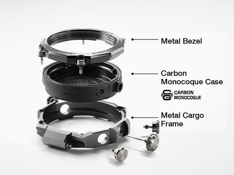 យើងបានរួមបញ្ចូលរចនាសម្ព័ន្ធការពារស្នូលពីរ MT-G ដើមជាមួយនឹងការការពារស្នូលកាបូន G-SHOCK ចុងក្រោយបំផុត។ ប្រអប់នាឡិកាម៉ូណូខូកដែលធ្វើពីជ័រពង្រឹងដោយសរសៃកាបូនត្រូវបានដាក់នៅខាងក្នុងគ្រោងលោហៈដែលភ្ជាប់កងមុខនាឡិកា ដែលទទួលបានរួមគ្នាក្នុងពេលតែមួយនូវភាពរឹងមាំដ៏ខ្លាំង ភាពបិទជិតគ្មានខ្យល់ចូល និងមានទម្ងន់ស្រាលជាងមុន។