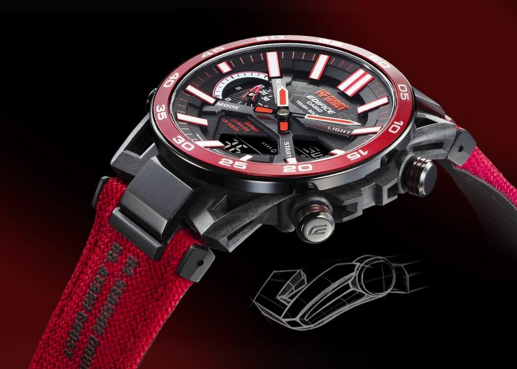 ECB-2000MFG는 독특한 고성능 모터스포츠 시계로서, 모터스포츠가 소재인 두 인기 만화 이니셜 D와 MF 고스트의 작가 시게노 슈이치(Shuichi Shigeno)와 EDIFICE의 특별한 콜라보레이션으로 탄생하였습니다. 이니셜 D의 주인공은 가파른 산길을 따라 경주를 합니다. 1995년부터 2013년까지 Kodansha Ltd.가 발간한 Young Magazine에서 연재되었으며, 5600만 부 이상 팔린 인기작입니다. 시게노의 공도 레이싱 만화 MF 고스트는 2017년부터 같은 잡지에 연재되었으며, 2023년에 TV 애니메이션 시리즈가 개봉됩니다. 이 꿈의 콜라보레이션을 통해 멋진 시계의 디자인 전체에 이니셜 D와 MF 고스트 세계관을 함께 담았습니다. 빨간색과 검은색 디자인은 MF 고스트 주인공 카나타 리빙턴이 운전하는 Toyota GT86이 모티브입니다. 다이얼의 밑면과 가죽 밴드 아래쪽에는 이니셜 D와 MF 고스트의 페이지를 가로지르는 ギャアア(도로를 가로지르는 타이어의 날카로운 소리로 '갸아아'로 발음. 한국어판에서는 '쿠앙'으로 번역.)라는 의태어가 새겨져 있습니다. 밴드 아래쪽에는 이니셜 D 주인공인 후지와라 타쿠미가 운전하는 Toyota AE86의 측면의 후지와라 두부가게(자가용)을 뜻하는 친숙한 글자 "藤原とうふ店(自家用)"이 새겨져 있습니다. Bluetooth®로 간편하게 시계를 작동할 수 있는 스마트폰 연결 기능, Tough Solar 충전 기능이 있는 고성능 크로노그래프 덕택에 이동 중에도 집중할 수 있습니다.