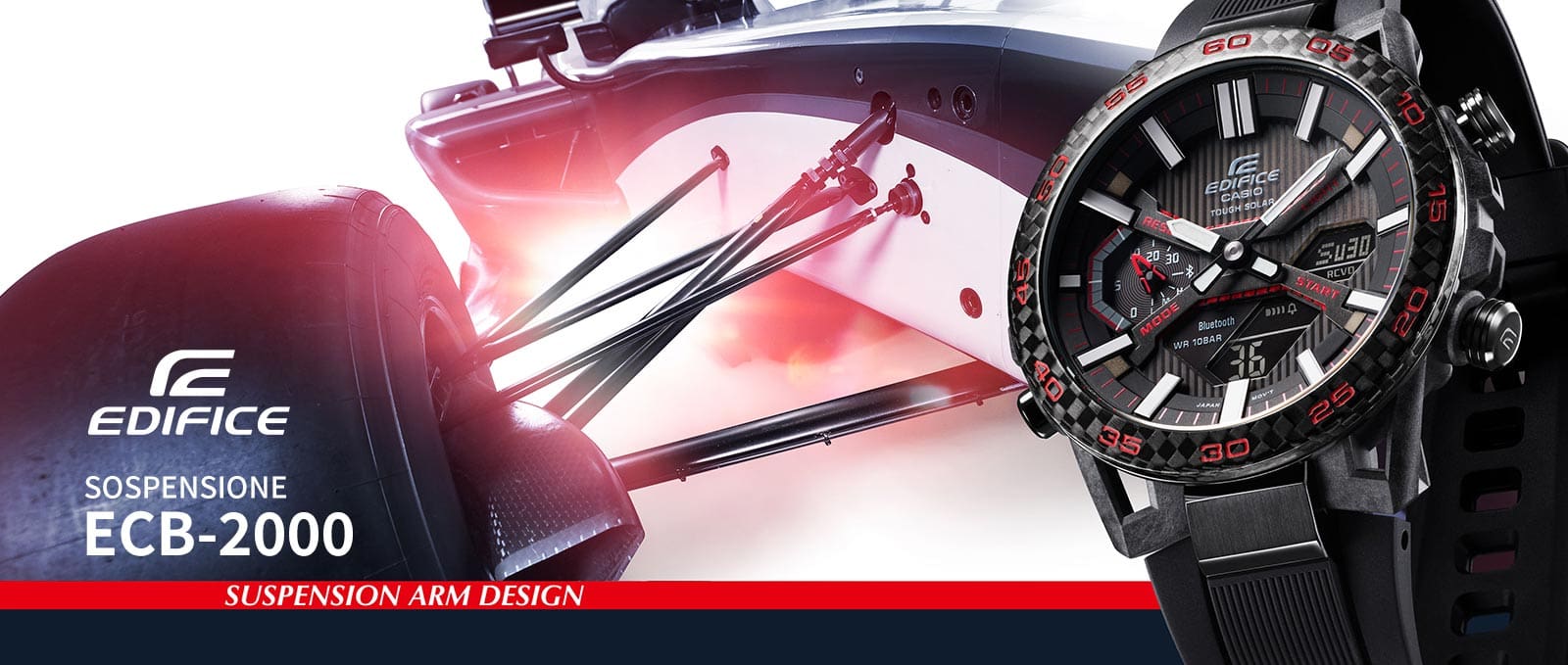 EDIFICE 라인에서 최초로 선보이는 탄소 섬유 강화 수지 케이스로, 서스펜션 암 디자인을 채택했습니다. 레이싱 카에서 영감을 얻은 기계식 문자반을 제공합니다. 무엇보다도 레이싱 활동에 도움이 되는 스마트폰 연결 및 Tough Solar 기능을 사용할 수 있습니다. 레이싱 팀이 요구하는 기능과 안정성을 구현한 제품으로, ‘진정한 모터스포츠’ 컨셉을 바탕으로 한 독특한 디자인 접근 방식과 첨단 기술을 통해 제작되었습니다.