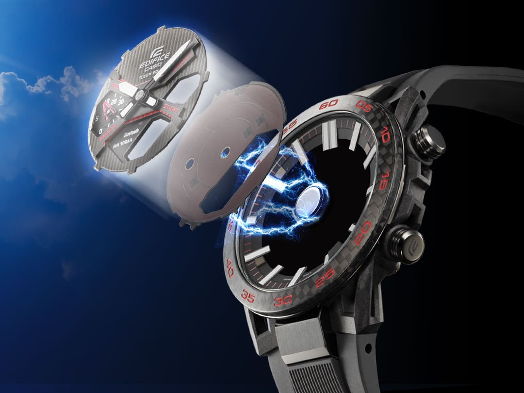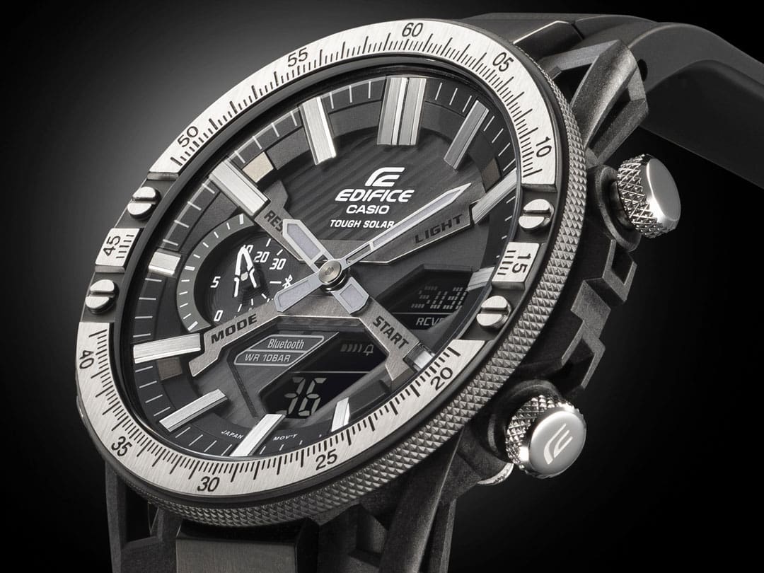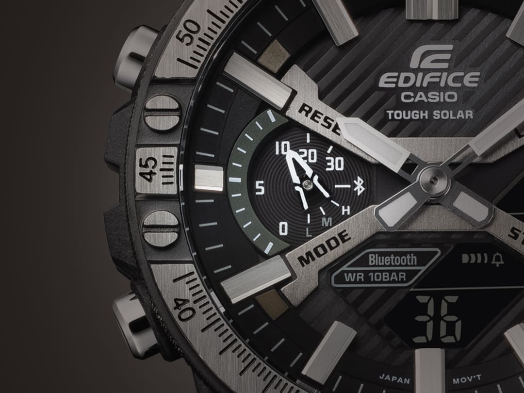 EDIFICE 차량 툴킷에서 영감을 얻은 디자인 시리즈 전문 차량 공구에서 영감을 얻은 대담하고 복잡한 디자인으로 파워와 정밀도를 세밀하게 조정하세요. 특수 고성능 모터스포츠 시계인 EDIFICE ECB-2000TP는 차량 애호가의 툴킷의 세련됨과 정교한 디테일을 자랑합니다. 이 시계는 포뮬러 카 서스펜션의 더블 위시본 구성에서 영감을 받은 EDIFICE SOSPENSIONE ECB-2000의 독특한 케이스 디자인을 통합합니다. 전체 디자인의 강도와 견고함을 보완하고자 메탈 베젤은 블랙과 실버의 강력한 투톤 조합으로 마감되었습니다. 초기 블랙 이온 도금으로 베젤 상단의 블랙을 제거하여 광택 처리된 하단 실버 색상이 드러납니다. 세밀한 측정 마크와 널링은 시계에 영감을 준 전문 도구와 특수 기기의 대담함, 정밀도, 고품질의 외관을 보여줍니다. Bluetooth®를 통해 스마트폰과 간편하게 동기화할 수 있습니다. 앱을 탭하면 자동차 애호가들에게 매우 중요한 기능에 액세스할 수 있습니다. 자동 조정된 정밀 시간 표시 기능을 사용하고, 전 세계 300곳 이상 도시의 세계 시간 목록을 손쉽게 관리하고, 밀리초 단위로 측정된 스톱워치 데이터를 스마트폰으로 전송할 수 있으며, 시계의 버튼을 길게 눌러 휴대폰을 찾을 수 있습니다. 이외에도 다양한 기능이 있습니다! Tough Solar는 시계를 햇빛이나 형광등으로부터 충전합니다.