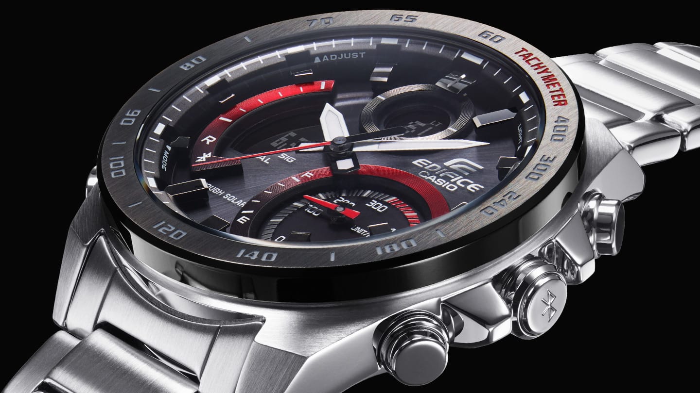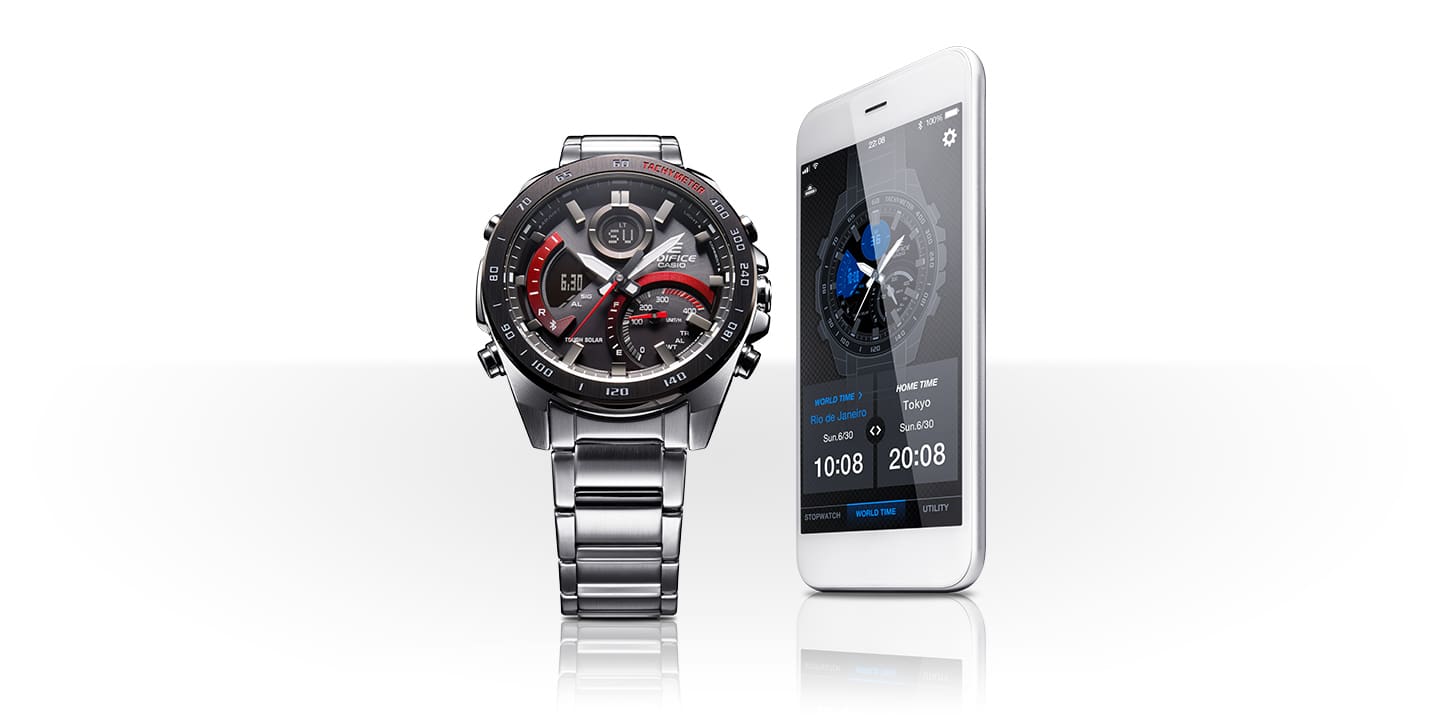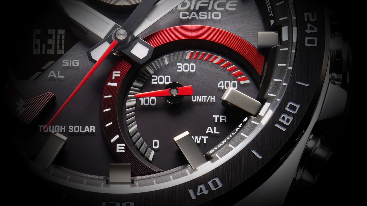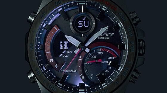 스마트폰 연결 | "EDIFICE" 스마트폰 연결 시리즈의 디지털/아날로그 콤비네이션 모델 바늘 포인터 외에도 LCD를 통해 다양한 형태의 정보를 이해하기 쉬운 방식으로 표시하는 다기능 모델입니다. Bluetooth를 통해 스마트폰에 연결하여 정확한 분할 초 기능으로 시간을 표시하며, 착용자가 약 300개 도시 중에서 쉽게 선택할 수 있는 세계 시간 표시 기능도 있습니다. 4시 방향에 있는 큰 내부 다이얼은 속도 표시기입니다. 랩 타임을 측정할 때 설정된 거리를 기준으로 평균 속도를 나타내는 기호가 표시됩니다. 손목을 간단히 기울이면 켜지는 자동 LED 조명이 장착되어 있어 야간에 가시성을 높여 줍니다. 스크래치 방지 골드 이온 플레이트로 베젤을 처리하면서 천연 가죽 밴드를 사용하여 스포티하면서도 전통적인 디자인을 완성했습니다.
